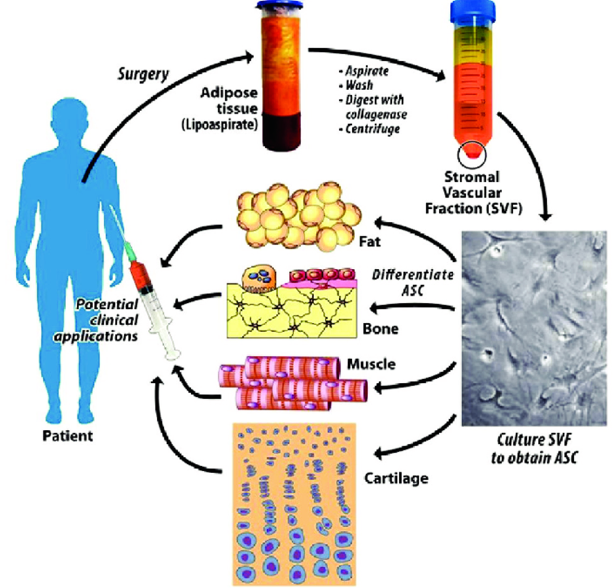 El tejido adiposo también contiene la “fracción vascular estromal”, una mezcla de células madre, otros tipos de células y factores de crecimiento con notables propiedades regenerativas. Esta fracción desempeña un papel decisivo en los efectos terapéuticos observados cuando se utiliza tejido adiposo en medicina regenerativa.